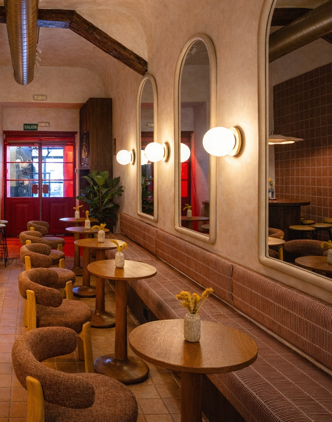 Terracotta defines the atmosphere — applied across floors, textiles, and finishes — shaping the interior into a warm, handcrafted nest. The composition balances sharp detailing with tactile materials, resulting in a curated tension between reflection, color, palette, texture, and art — a controlled and intentional chaos.